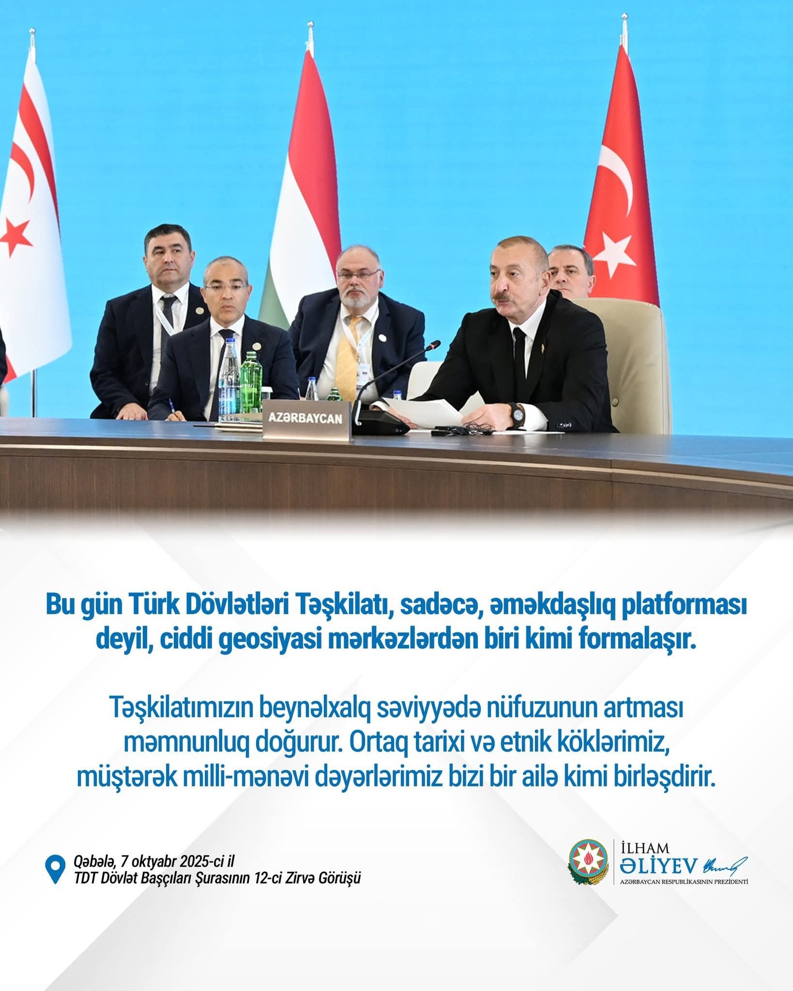 Qəbələdə oktyabrın 7-də Türk Dövlətləri Təşkilatının (TDT) Dövlət Başçıları Şurasının 12-ci Zirvə Görüşü keçirilib. Azərbaycan Respublikasının Prezidenti İlham Əliyev çıxışında Türk dünyasının əməkdaşlığı, regional təhlükəsizlik və iqtisadi inteqrasiya məsələlərinə dair mühüm fikirlər səsləndirib.